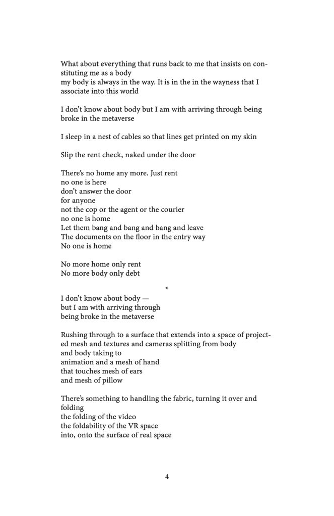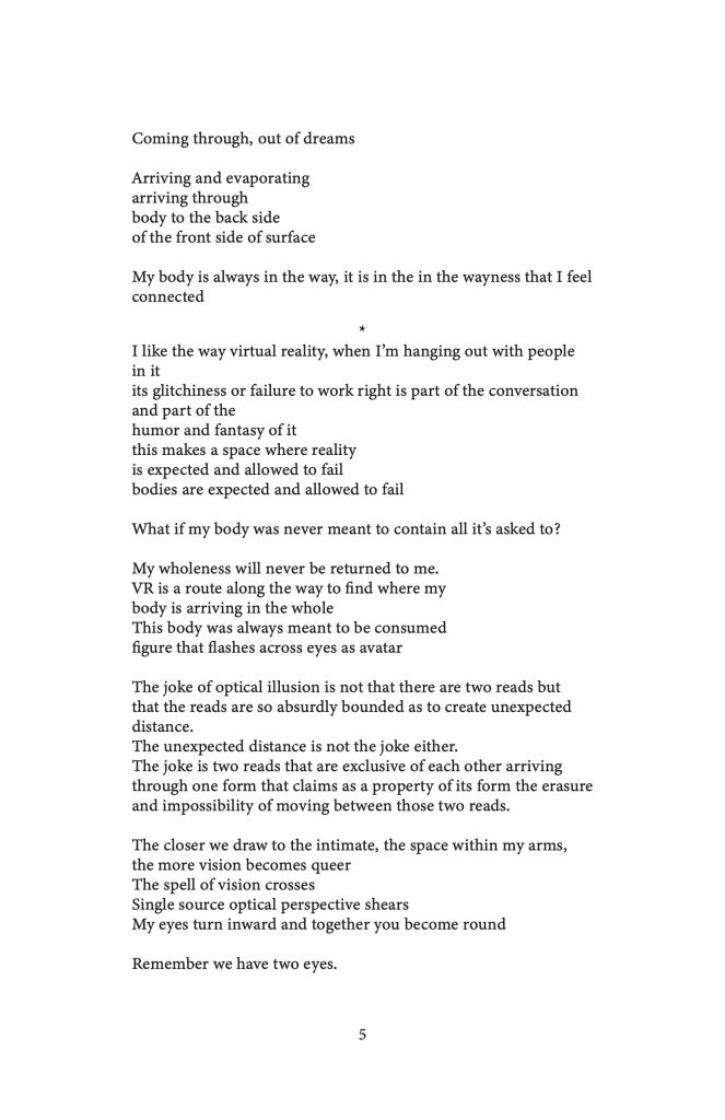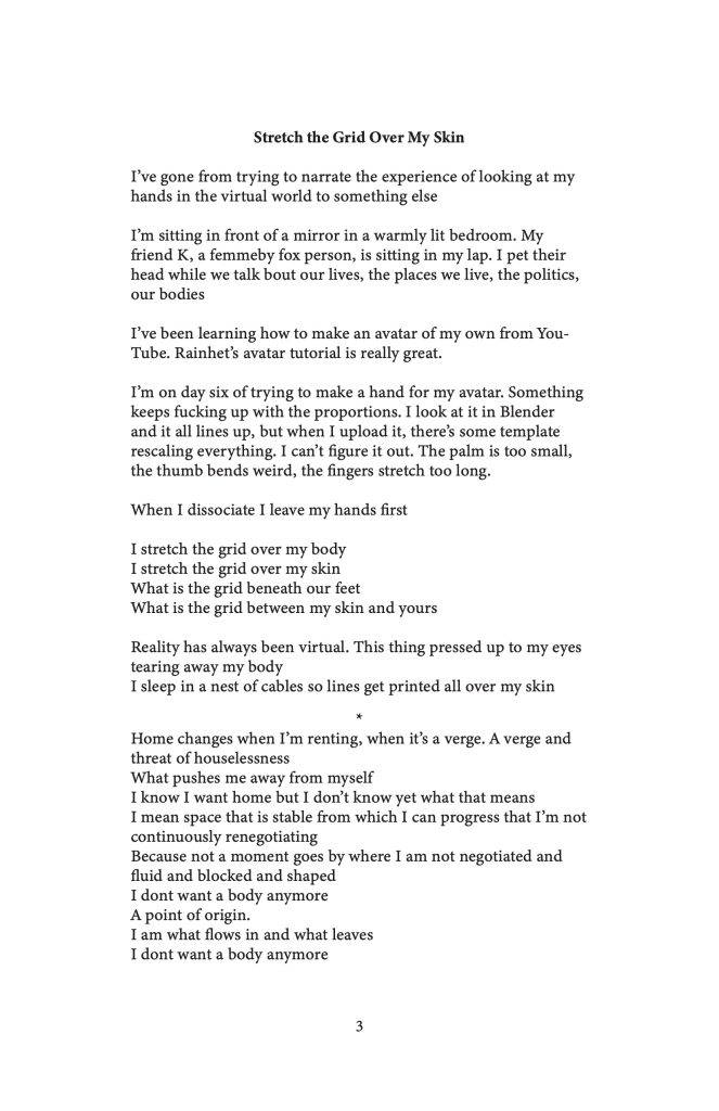 I Don’t Want a Body Anymore, is a 20 page zine that documents a year of my living in virtual reality with an international coven of trans catgirls. The zine follows my creation of my first avatar. It reflects on what it means as a trans person to have agency and creativity over one’s body and figure. Virtual reality like transness becomes a way of illuminating the boundaries of the body. Where does my immediate physical body end and where does it merge into the technological? Is there an embodiment through the technological that is collective and public? When do I get to escape from the avatars or figures that are mapped over me IRL?