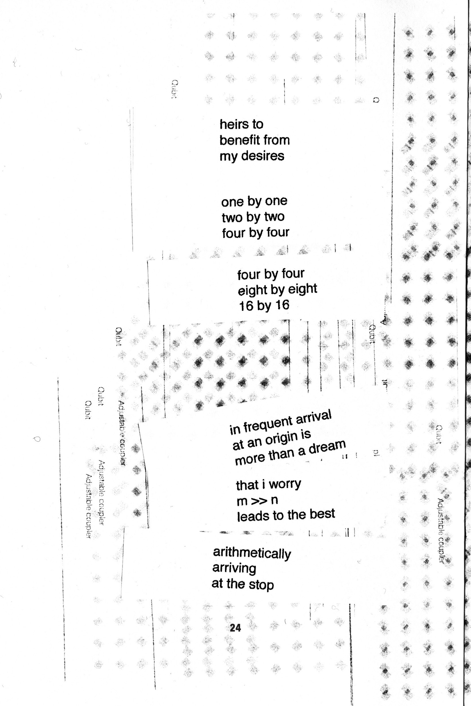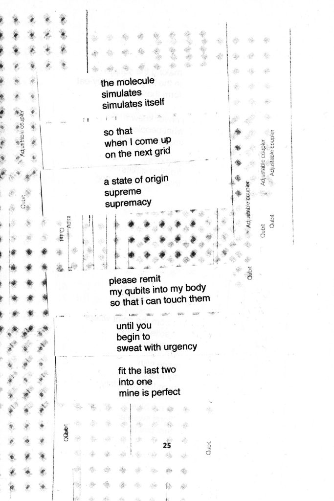 A trans hex on the birth of quantum supremacy, Please Remit My Qubits (Operating System, 2020) is chapbook of poetry. In 2019, Google achieved quantum supremacy — a quantum computer that could do in 200 seconds would take 10,000 years on a conventional super computer. Marie Hinson uses her trans embodiment and metaphysics to place a hex on this milestone of capitalism from points of origin to future simulations.